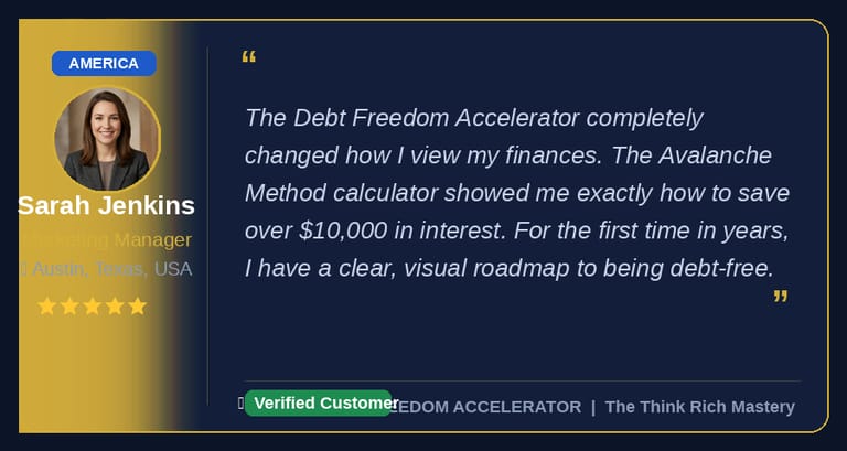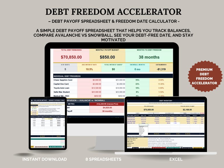 The Debt Freedom Accelerator is a simple debt payoff spreadsheet that helps you track balances, compare payoff methods, lower interest waste, and see your debt-free date in one place.